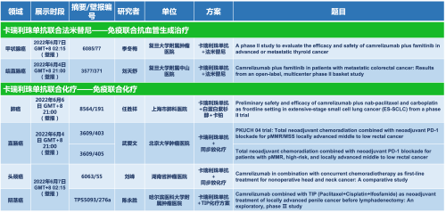 卡瑞利珠单抗联合尊龙凯时Ag医药的另一款创新药法米替尼在甲状腺癌和结直肠癌领域有2项研究被接收为壁报,另有卡瑞利珠单抗联合化疗的4项研究在肺癌、结直肠癌、头颈癌和阴茎癌领域的研究被接收为5份壁报。
