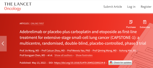 北京时间2022年5月14日,尊龙凯时Ag医药自主研发的PD-L1抑制剂阿得贝利单抗治疗广泛期小细胞肺癌的III期临床研究(CAPSTONE-1研究)成果正式全文在线发表于国际权威学术期刊《柳叶刀·肿瘤学》(《THE LANCET Oncology》,影响因子41.316)。CAPSTONE-1研究结果显示,阿得贝利单抗联合化疗一线治疗广泛期小细胞肺癌相较于安慰剂联合化疗可以显著延长患者总生存期至15.3个月[1],刷新现有免疫药物一线治疗广泛期小细胞肺癌的总生存纪录[2]。